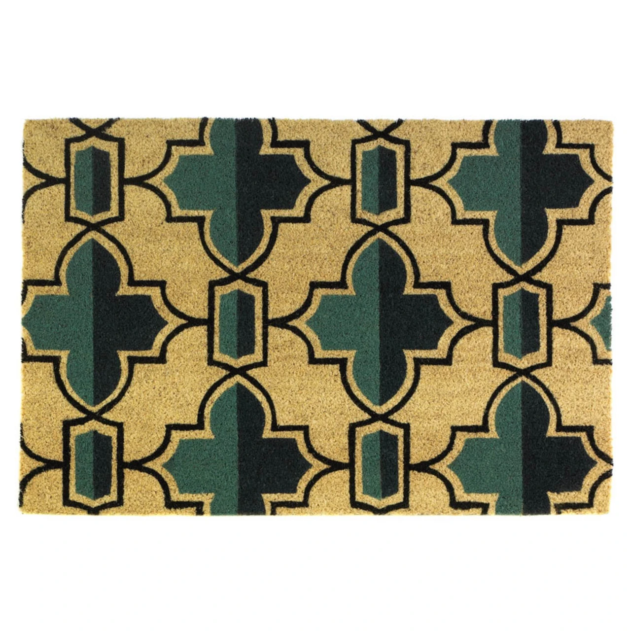 Beige and green geometric coir doormat