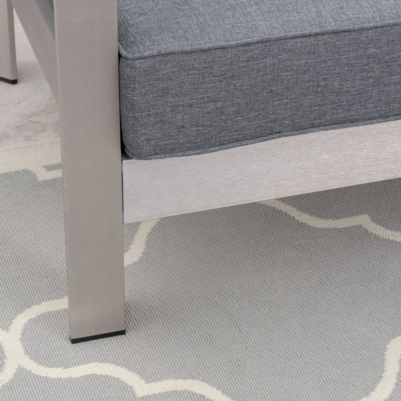 Silver and gray outdoor aluminum loveseat and tempered glass-topped coffee table