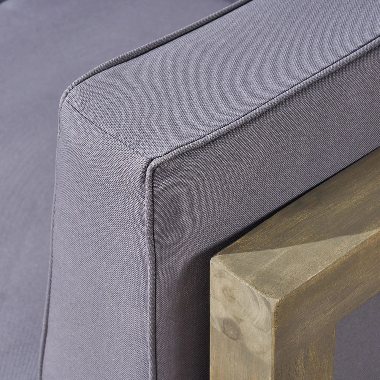 Gray outdoor modular acacia wood loveseat and coffee table set with cushions, water-resistant cushions
