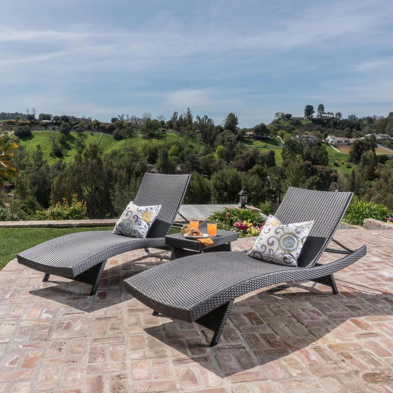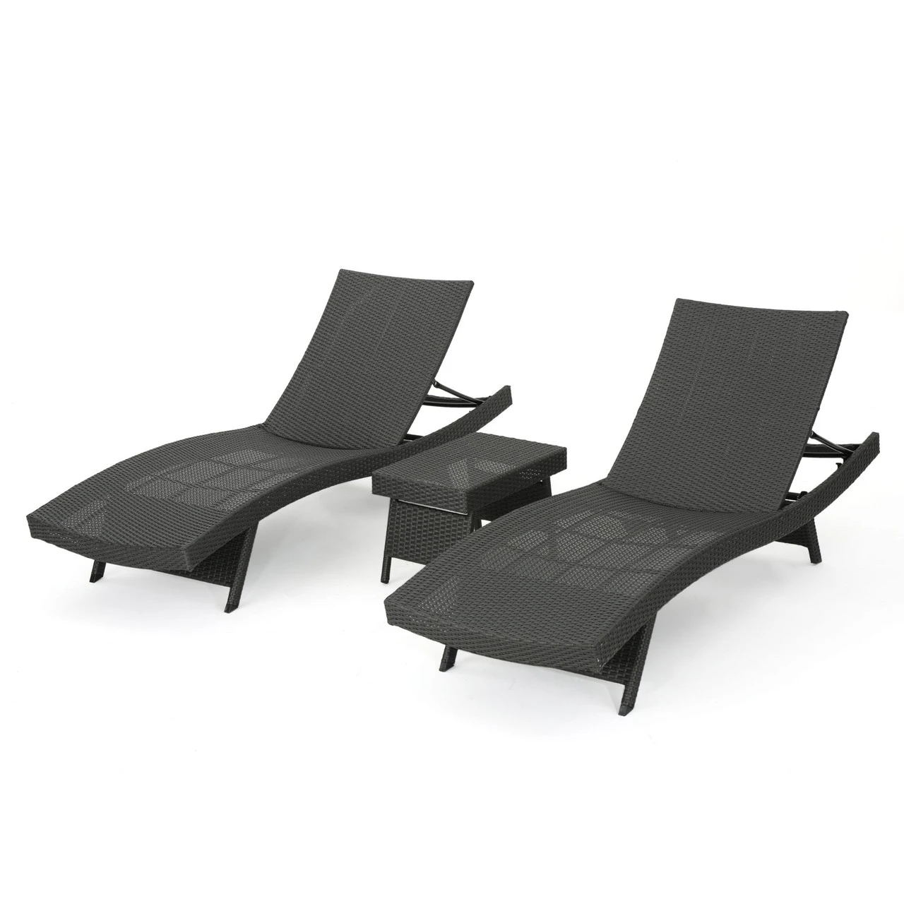 3 piece gray wicker outdoor patio adjustable chaise lounges and tables set