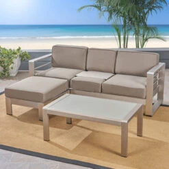3 pieces feature a sleek and modern anodized aluminum frame; the couch’s cushions are thick, inviting, and weather-resistant