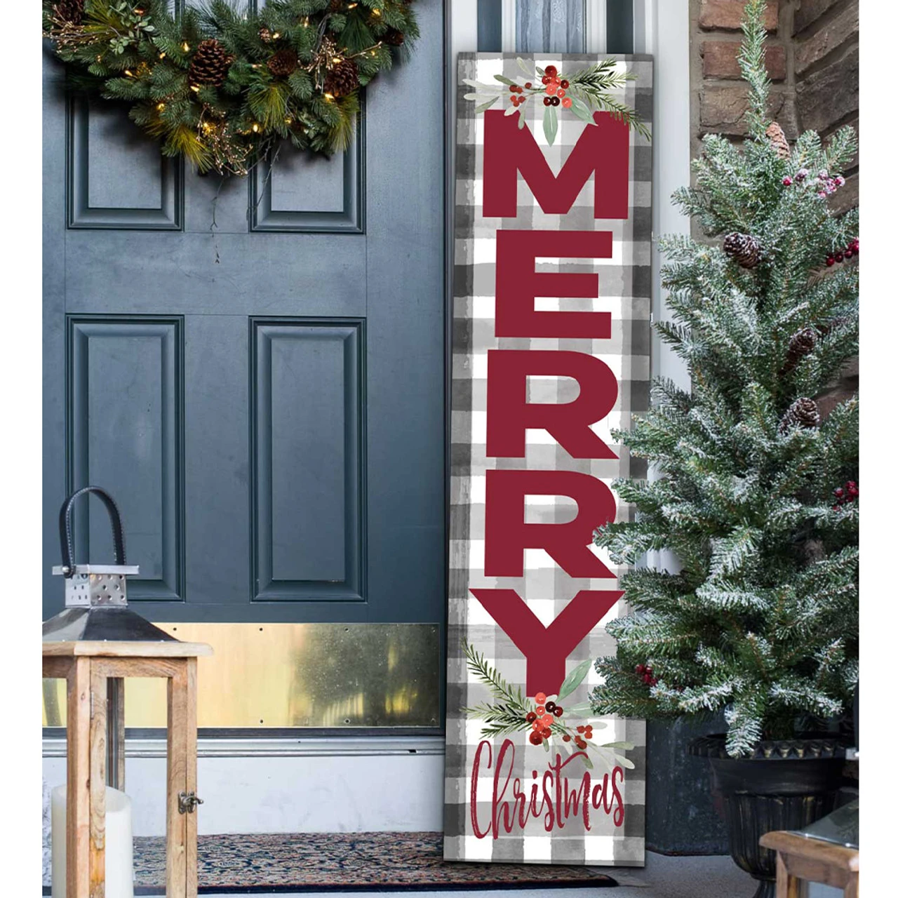Depicts a buffalo check background and reads “Merry Christmas” accented with winter foliage