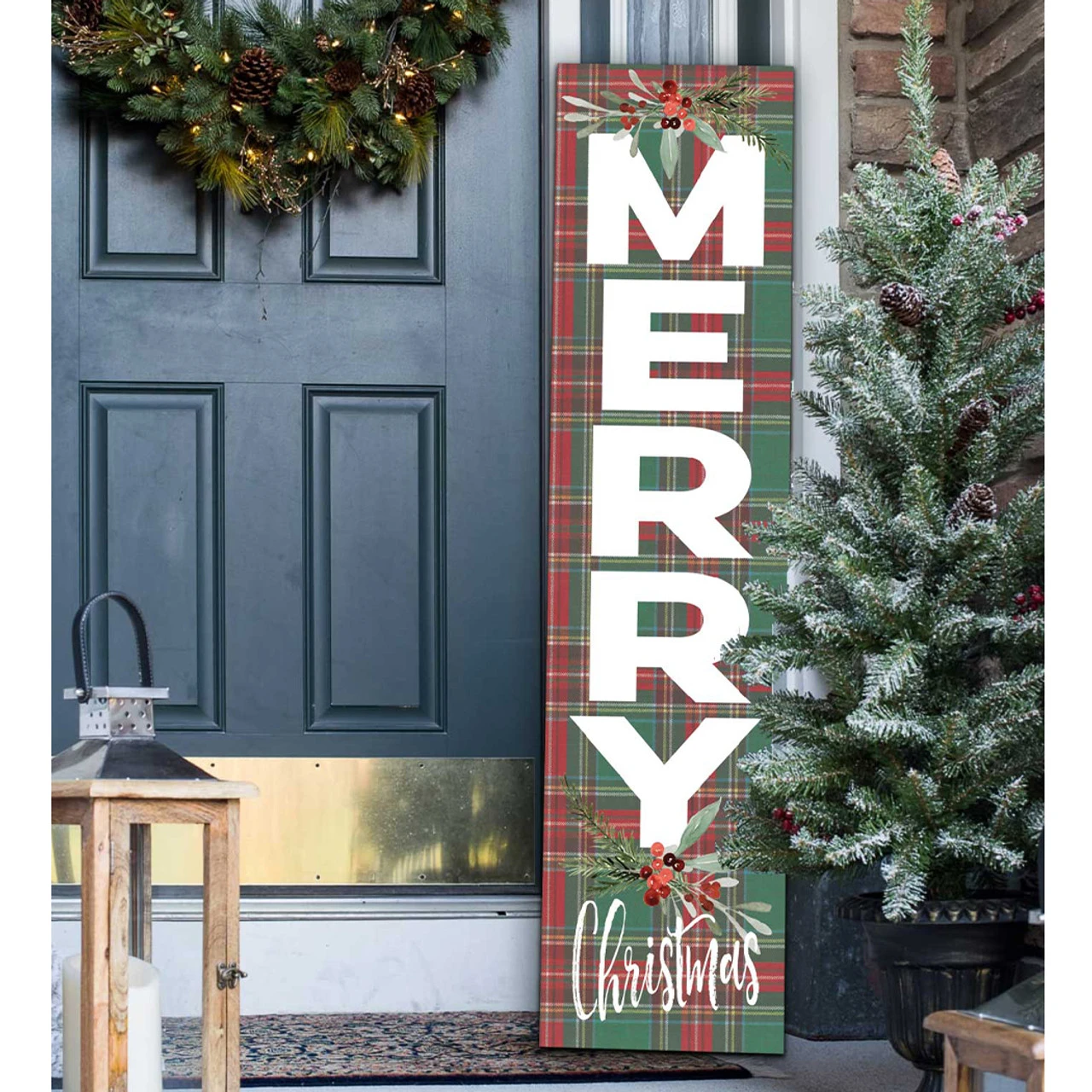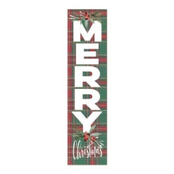 Depicts a tartan background and reads “Merry Christmas” accented with winter foliage
