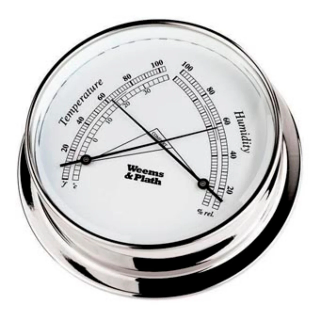 Comfortmeter in chrome finish monitors both temperature and humidity either indoors or outdoors