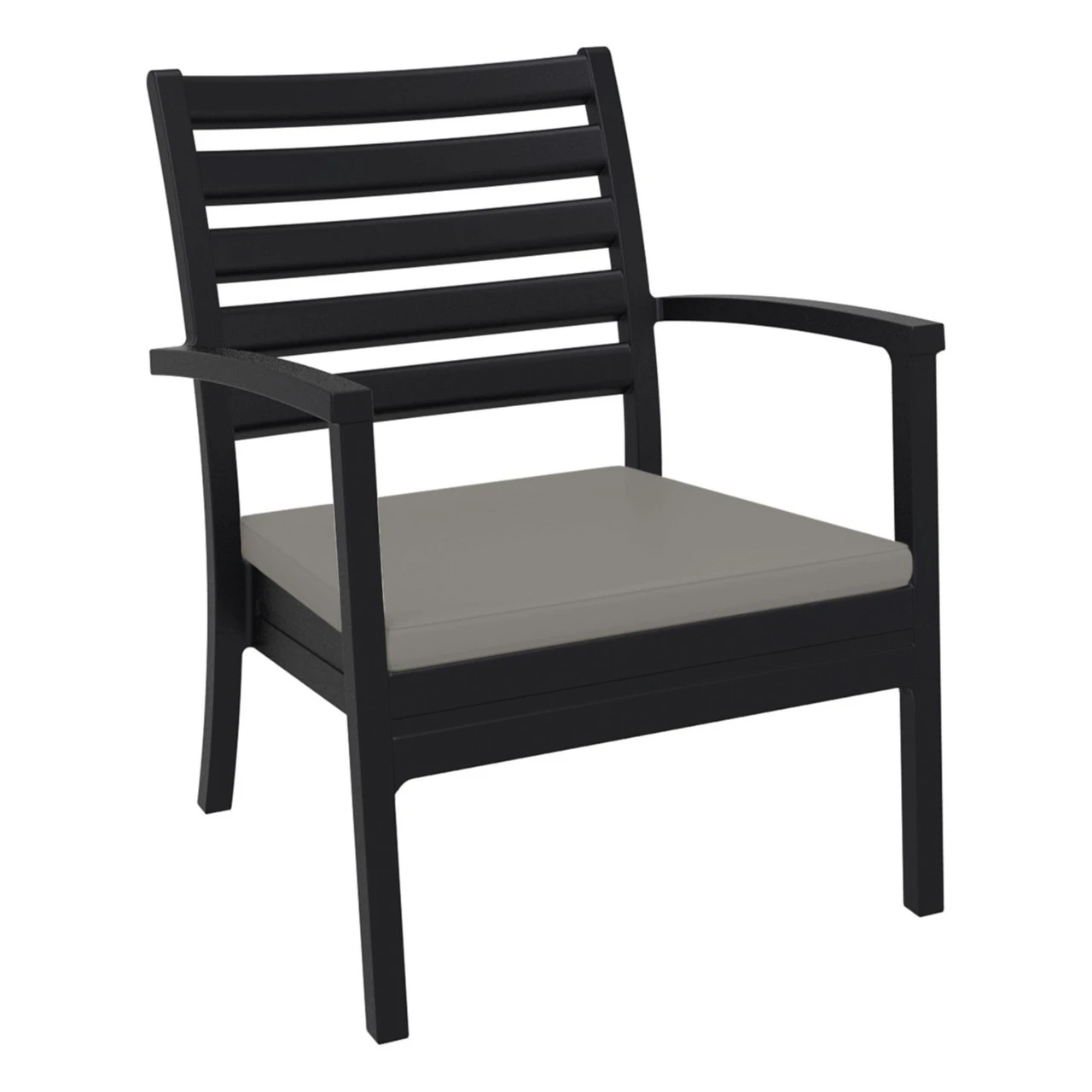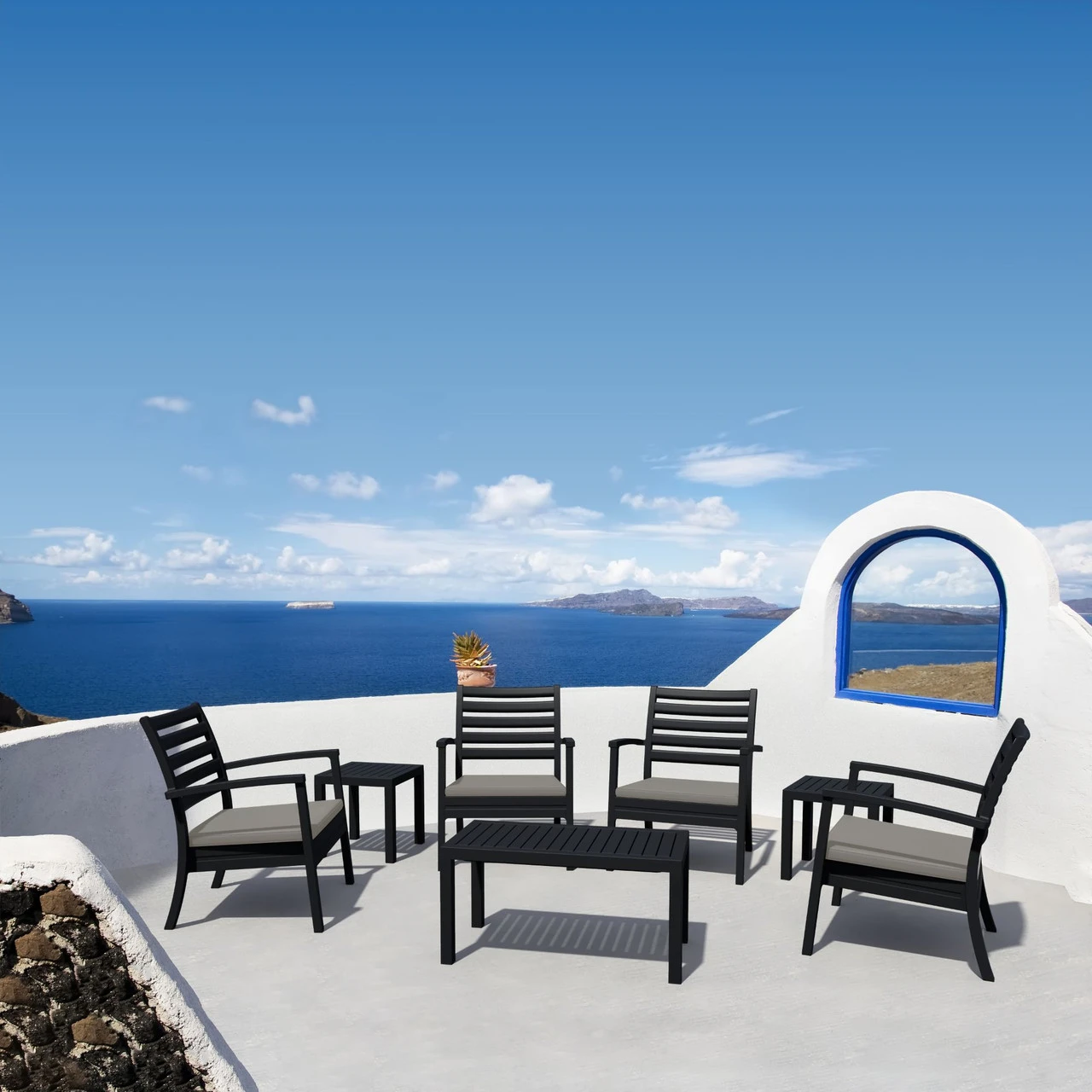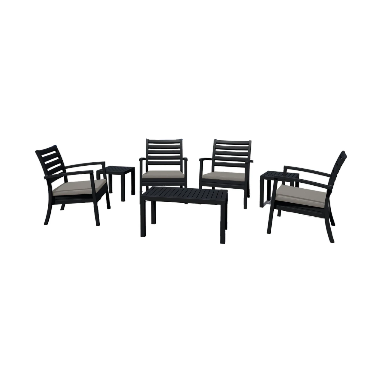 Includes four club armchairs, two square side tables and one rectangle coffee table
