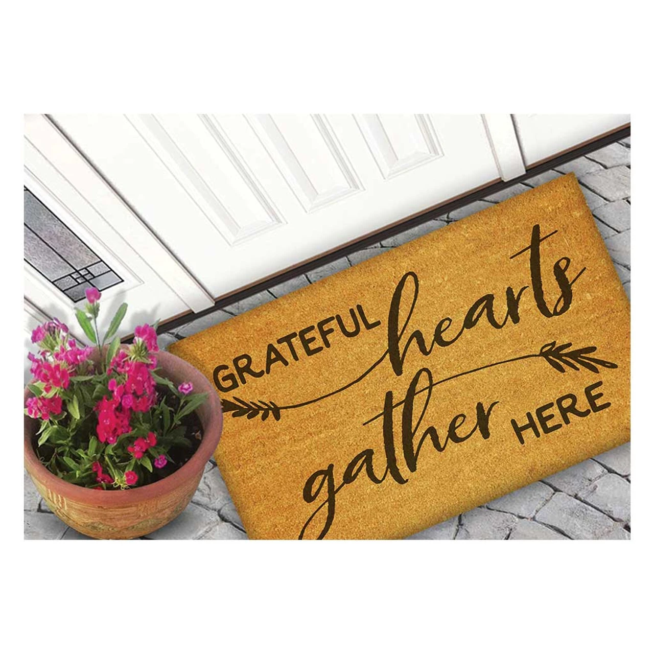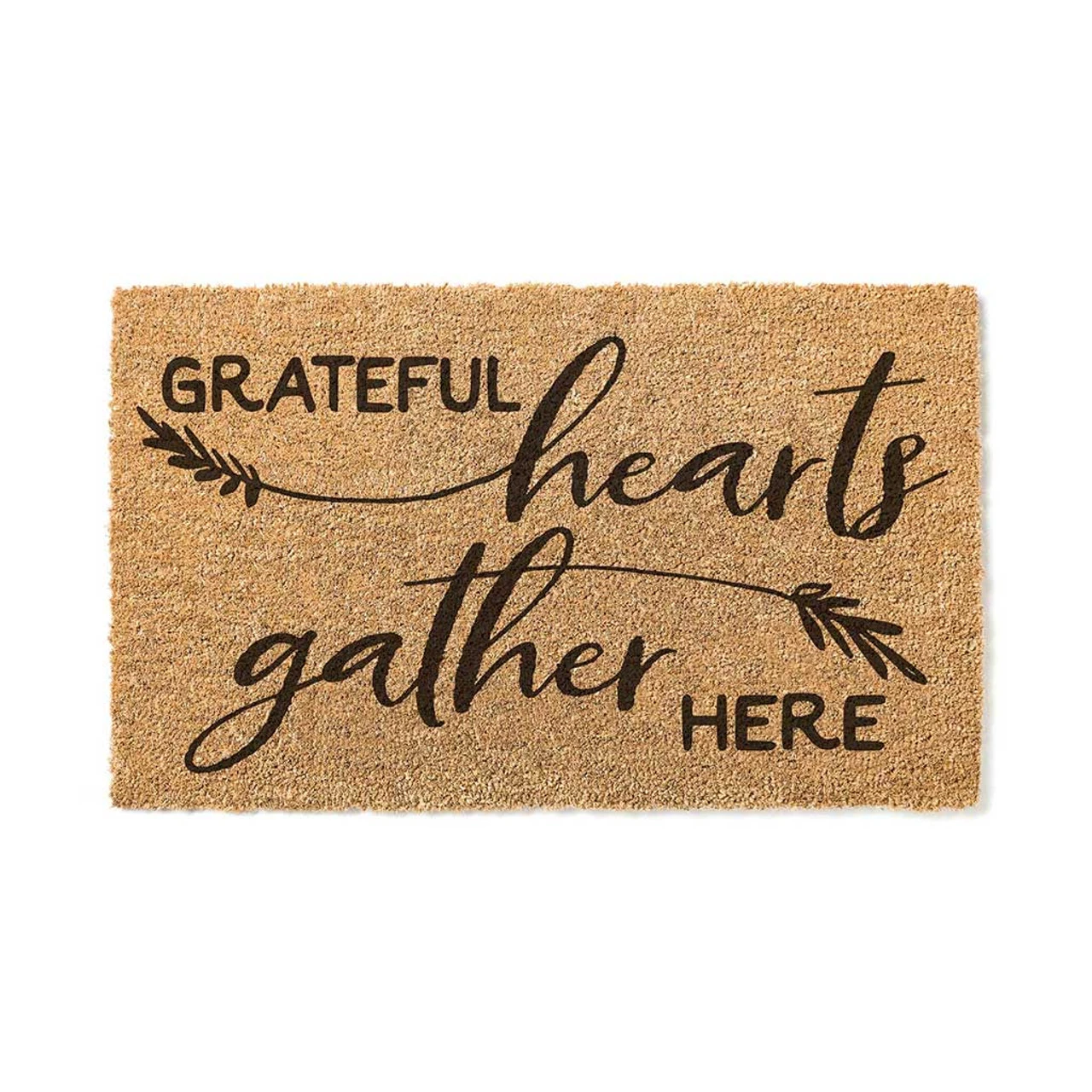 It reads “Grateful Hearts Gather Here” in cursive and bold letters