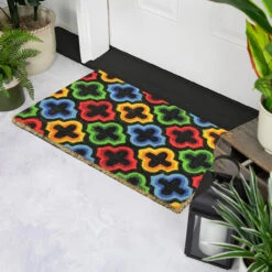 Features green, red, yellow and blue color outdoor mat