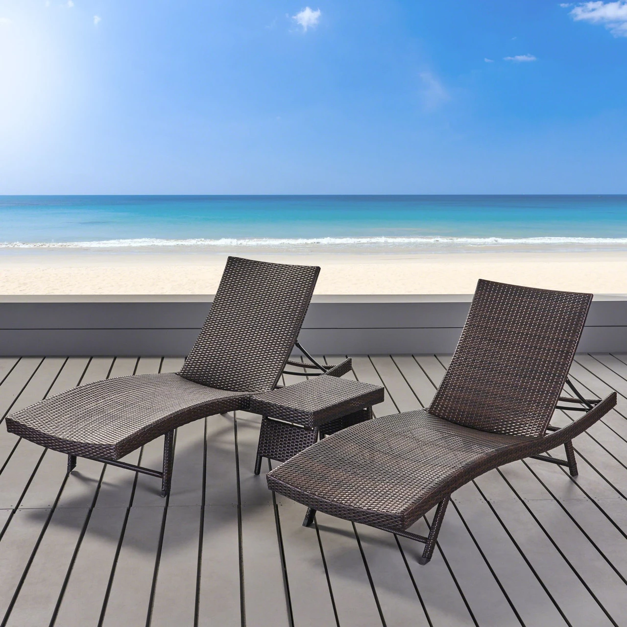 Set of 3 brown mesh outdoor patio chaise lounges and table set